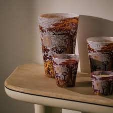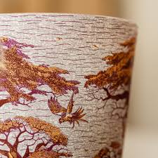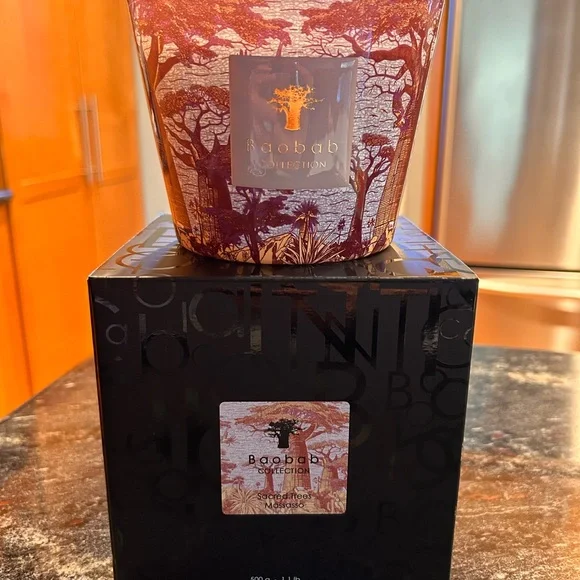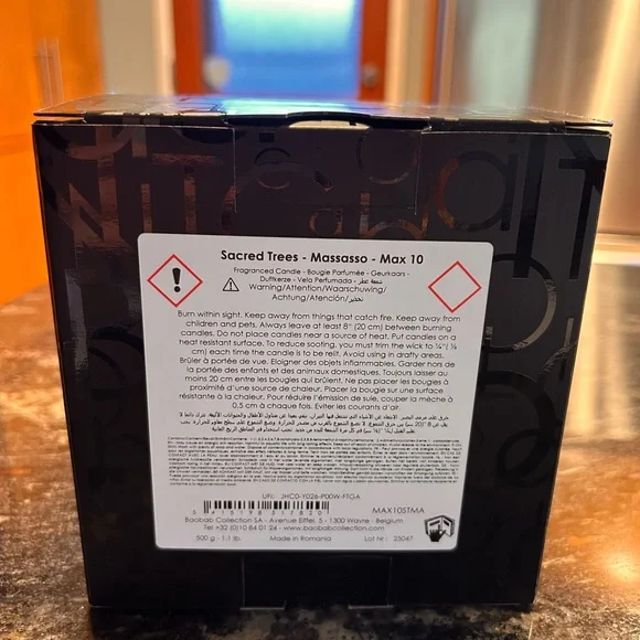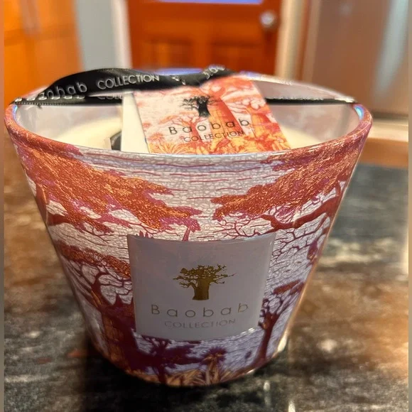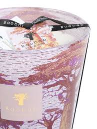The Massasso scented candle is covered in an original design depicting a baobab forest in a mix of lilac and brown. The design, the result of our collaboration with Uniwax in Abidjan, is an original graphic in the great tradition of figurative African wax. The design, printed using natural pigments, is applied to the glass using a very special sublimation method produced in Italy. Using a fusion method, the design is then integrated into the glass. This know-how allows a certain transparency to be maintained; under the impulse of the flame, the design comes to life like a lamp.